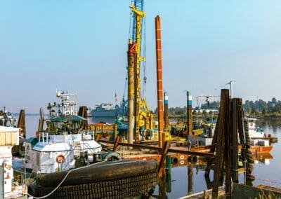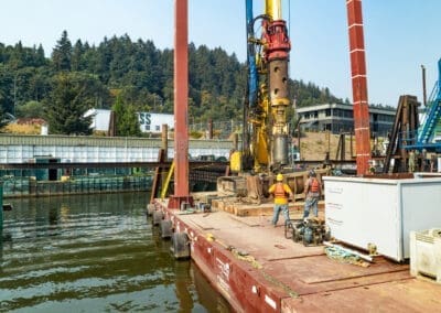 On this project, Pacific Foundation was retained to pre-bore shafts for a new dock construction along the Columbia River, one of the world’s most challenging waterways. Using a barge-mounted BG24H, Pacific is installing 36″ temporary casing and grout to support the new permanent dock piles.