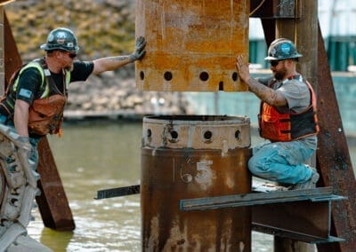 The dock’s foundation uses 36-inch pre-bored piles with temporary casing, installed with a barge-mounted BG24 drill rig, ensuring stable, deep foundations in challenging riverbed conditions while minimizing environmental impact.